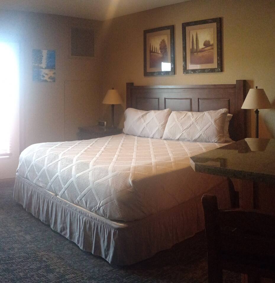 This condo offers a king size bed and a twin murphy bunk bed that folds off the wall featuring a gel memory foam mattresses, a full bathroom, kitchenette, and patio. With recent updates such as new carpet throughout, new furnishings, and blackout curtains this condo will make you feel at home. Guests can purchase water park passes online but they are not included in the rental price. Permit 19-09