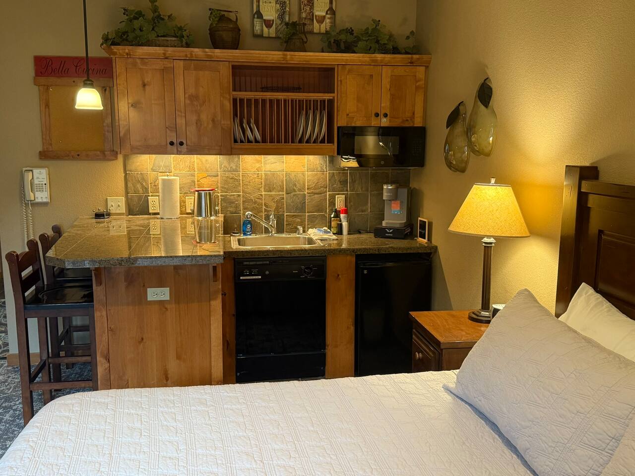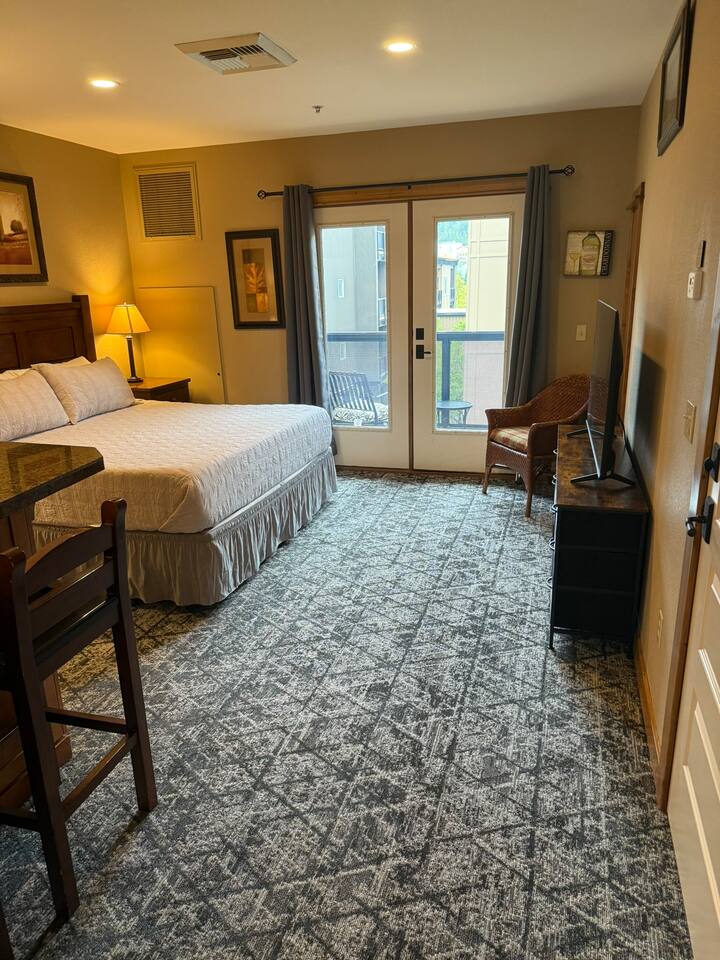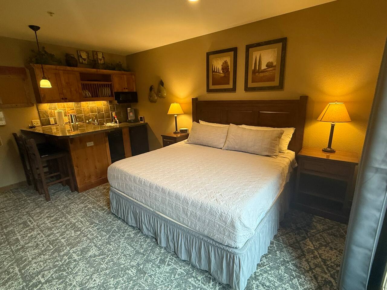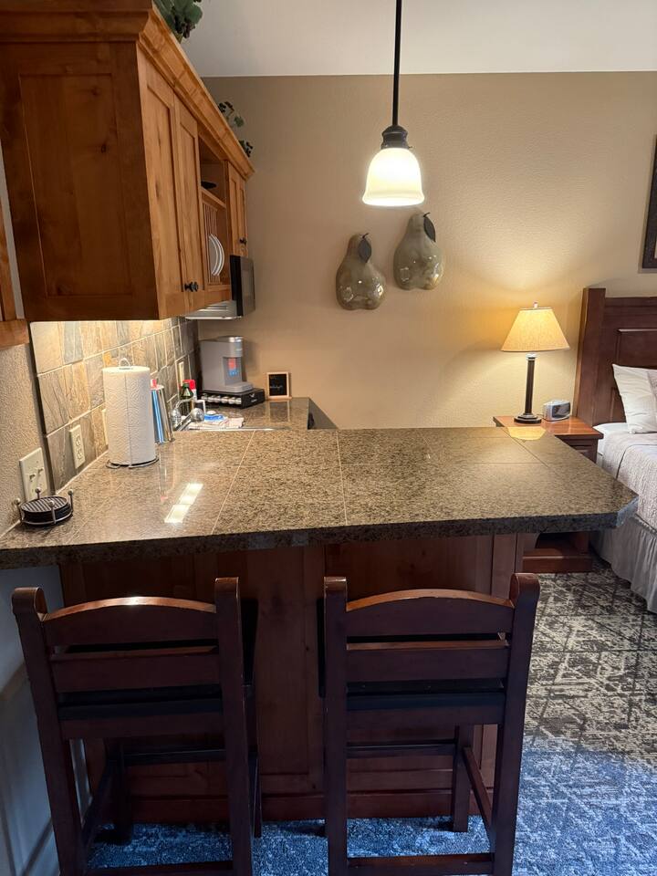 This studio condo offers a king size bed, a full bathroom, kitchenette, and patio. With recent updates such as new carpet throughout, new furnishings, and blackout curtains this condo will make you feel at home. The hot tubs and laundry room are on the first floor. There are areas to store your bikes and your skis for you to enjoy all that Silver Mountain Resort has to offer. Guests can purchase water park passes online but they are not included in the rental price. Permit 19-09